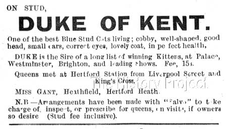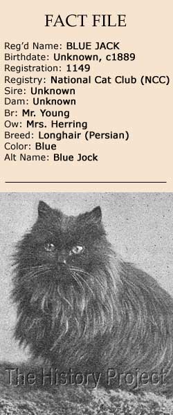 'Blue Jack' was bred by a Mr. Young, from unknown (or unrecorded) parents, probably born in 1889 or earlier. He quickly became the property of Mrs. L. Herring. An analysis of all the registrations of cats owned by Mrs. Herring that appear in The National Cat Club's Studbook and Register, shows that a disproportionate number of cats registered in her name, are of unknown parentage. Although in the early years this may have truly been a necessity, one is left wondering if perhaps her paperwork was not as good as it either could, or should have been.