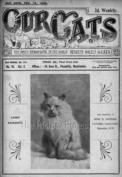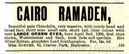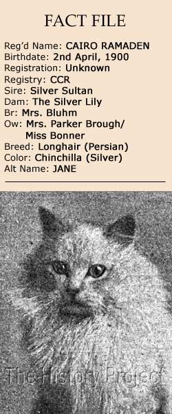 HISTORICAL BACKGROUND:An excellent heading to the history of this Chinchilla male of such sweet countenance, could simply be "MISSING!" At the time of writing he is not listed in any online database, nor do we find any record of him in any of the usually reliable historical writings by authors such as Miss Frances Simpson, Mr. C.A.House, Mrs. Dorothy Champion, or even the lady author with the alias, Dick Whittington! Nevertheless, he did exist, and as this portrait shows, he was a chinchilla cat, delightful to behold and with an amazing secret; a simply outstanding pedigree! The only record of his existence is his entry in The Cat Club Register, where his name is listed as 'Cairo Ramadan', bred by Mrs. Bluhm.6 His pedigree however, is possibly one of the most resplendent to be found, combining the bloodlines of 'The Silver Sultan' with those of 'The Silver Lily'. Thankfully, this portrait of him survives from the pages of Our Cats where, in the 14th February issue of 1903, his image is featured, on the front cover, with the spelling of 'Cairo Ramaden'. His very clear outstanding feature, are his bold clear eyes, which Miss Bonner describes in his stud advertisement as "very LARGE GREEN EYES". Even through the poor quality of the printed photograph, the eyes appear clear and vivid, beautifully outlined with a well-defined, highly desirable 'mascara', a feature which we delight to see in a clear-coated Chinchilla to this very day. PARENTAGE & OWNERSHIP:'Ramaden' was born 2nd April, 1900, bred by Mrs. Bluhm, who, along with a handful of others, owned and bred with some of the best Chinchilla lines in the United Kingdom. His sire was Mrs Bluhm's 'Silver Sultan', a worthy son of 'Ch. Lord Southampton', himself the most prized and clear-coated son of the great 'Ch. Silver Lambkin' and 'Southampton Duchess', thereby also bringing into the mix, the Blue strain of 'Ch. Bundle' and through 'I, Beauty's Daughter', 'Ch. Nizam' and a second helping of 'Beauty of Bridgeyate'. The dam of 'Silver Sultan' was 'Chilton Silver Berry', a daughter of 'Ch. Silver Mist' yet another Silver male sired by 'Ch. Silver Lambkin'. She also brought into the pedigree a second helping of 'Ch. Perso'. The dam of 'Cairo Ramaden', was 'The Silver Lily' who, as probably the prettiest daughter of 'Ch. Silver Lambkin', brought to this combination, a heavy line-breeding on her illustrious sire, plus the well-proven capabilities of her amazing little dam, 'Dossie', a grand-daughter of the little known 'Charlbury Silver King', a Silver Tabby full brother to none other than 'Ch.Silver Lambkin' himself!