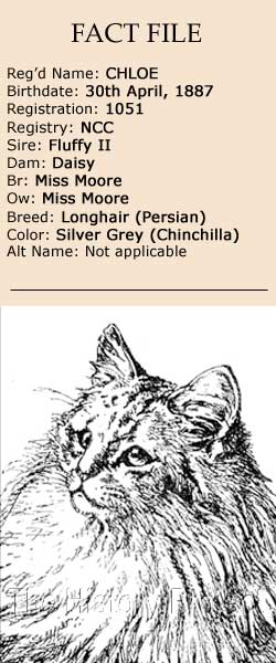 What is not so generally well-known, is that the parentage of 'Fluffy II' is exactly the same as that of 'Beauty of Bridgeyate', the dam of immortalised 'Ch. Silver Lambkin', considered to be 'The Father of the Chinchilla' breed variety. Although we have no registration records available to us for 'Fluffy II', it does not seem inconceivable that he could have even been a litter brother to 'Beauty of Bridgeyate', (NCC:1885) who was born 1st April, 1885. The dam of 'Chloe' was Miss Moore's 'Daisy', (NCC:1050), born in May 18854. From her registration records we know that she was sired by 'Fez' and out of 'Judy' and if we turn to a passage written by Mrs. Balding (formerly Miss Dorothy Gresham), in The Book of the Cat (1903), we find an illuminating linkage to Mrs. Brydges original imports and 'The Silver Lambkins' and a full sister to 'Daisy' named 'Queenie', also owned by Miss Florence Moore. "Another Chinchilla of the early eighties was Miss Florence Moore's 'Queenie,' who would, had chinchilla classes been provided at that time, have been loaded with championships and honours. In colour she was as light as any of our present-day celebrities, and might easily, from her freedom of markings, have earned the dubious compliment of the uninitiated so highly prized by owners of chinchillas of being mistaken for a grubby white. "Miss Florence Moore, who later on had one of the best and largest catteries in the country, bred 'Queenie' from her 'Judy,' winner of many first prizes, a heavily marked silver tabby of Mrs. Brydges noted breed, and 'Fez,' a light silver cat with indefinite stripes."2
