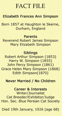 HISTORICAL OVERVIEW:Without any doubt, Frances Simpson would be the most 'quoted' cat fancier and judge from the first 60 years of the Cat Fancy. She was a most prolific and talented writer. She demonstrated an excellent grasp of the social mores and tact required to successfully navigate the highly charged political environment of such an intensely popular hobby, about which, she was personally and heavily engaged in promoting.