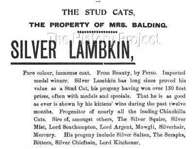 BREEDING & PROGENY:Although he must have stood at stud, there appear to be only four cats of record for his progeny. In what appears to have been his most significant litter; born to Miss Chappell's 'Victoria' on 17th April, 1899 came the silver male 'Cambyses'2 and the female 'Tamina'2, both registered as Chinchilla's. 'Tamina' was sold to Mrs. C. Reay Greene, while 'Cambyses' was fortunate to fall into the hands of the experienced judge and historian, Miss Frances Simpson. In due course, 'Cambyses' became a much loved pet as well as a stud. He lived in the residence as he did not spray and had a most amiable personality. Miss Simpson valued him for this, but also for his coat, which although barred when young, began to clear out as he matured, and in due course, she placed him at stud. Although she was not keen on showing him, on the few outings he finally did make, he not only competed successfully in his class, but went on to produce very clear-coated progeny of considerable note.