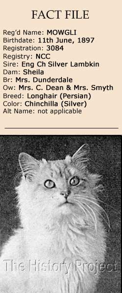 HISTORICAL BACKGROUND:'Mowgli' is a cat, which if he had not been the sire of Miss Frances Simpson's beloved 'Cambyses', might very well have flown 'under the radar' so-to-speak in historical terms. He was an extremely valuable male, being one of an exclusive club of silver males sired by the immortal 'Champion Silver Lambkin', who is generally referred to as 'the father of the Chinchilla' variety. Counted among his most famous sire-siblings, were 'Lord Southampton' (bred and owned originally by Mrs. Greenwood, then later the property of Lady Gertrude Decies) and 'Lord Argent', owned by Mrs. Florence Champion. Both of these males, feature heavily in the expansion of the breed, and many silvers from the period were line-bred based upon various combinations that included doubling either directly on 'Silver Lambkin' or his mother 'Beauty of Bridgeyate', or one of the sons of 'Silver Lambkin', and most particularly his son, 'Lord Southampton'. This of course, produced a myriad of silvers, but many of them were small, poorly boned and some were poor producers. In the rush to obtain the 'self-silver' (a Chinchilla without barring), much in-breeding based on those cats which were deemed to have the clearest coats took place, much to the detriment of the general health of the variety. 'Mowgli' appears to have been an exception to the trend in regard to size and substance. In an article on some of the early 'Pillars of the Stud Book' published in 'Our Cats' in May 1901, we find this interesting snippet which provides a comparison between the half -brothers 'Lord Southampton' and 'Mowgli': "First and foremost let me mention 'Lord Southampton who may now be said to have had his day. He was born in 1894, and was bred by Mrs. Greenwood, from 'Silver Lambkin' and 'Southampton Duchess'. Perhaps no stud cat ever made such a name for himself, and at one period, the difficulty was to find a silver cat unrelated to his Lordship. Hence a great deal of in-breeding which caused much weakness and loss of stamina in this particular variety of Persian cat. Nowadays there is a plethora of silver and Chinchilla stud cats from which to make a selection. We believe Lord Southampton is now in the possession of Lady Decies, but his name is no longer a household word among cat fanciers. 'Mowgli' was another silver pillar of the stud book, and only recently dropped out of the ranks and was gathered to his forefathers. He again was sired by 'Silver Lambkin', and bred by Mrs. Dunderdale. 'Mowgli' was more massive than 'Lord Southampton', with a better head."14 The above commentary was written by Miss Frances Simpson, whom we may surmise could have harboured a little bias in favour of 'Mowgli' as the sire of her beloved 'Cambyses;, but the tenor of her commentary is none-the-less based on fact. 'Mowgli' did appear to have a better head and to be a larger more substantial cat, and his son 'Cambyses' was known to weigh in the vicinity of 11-12 lbs. 'Lord Southampton' was indeed sold to Lady Decies, for what was then, the highest sum paid for any pedigreed cat in Great Britain, some £60 sterling. PARENTAGE & OWNERSHIP: