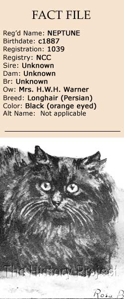 SIBLINGS & SHOWS:No specific information can be found to substantiate whether he had any siblings or half-siblings. However we do have some information on his early show wins, which included a First and two Seconds at the Crystal Palace in 1888; two Firsts, a National Cat Club medal, a Second and five Thirds, in 1891; two Firsts, a Silver Medal, a Second and a Fourth in 1892; thereby eventually gaining the much coveted Championship.2 BREEDING & PROGENY:'Neptune' appears to have been a singularly successful sire, who contributed his lines to Solids, Smokes, Tabbies and Chinchilla's during the early 1890's. Sons of record include: