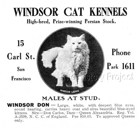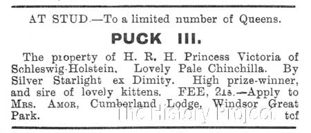 The report of wins by 'Venus' as a kitten, from the 7th February, 1903 issue of 'Our Cats':- "We think all cat lovers will rejoice to hear of the success of HRH Princess Victoria of Schleswig-Holstein in Manchester last week. Besides winning two third prizes with the pretty blue queen Kilpatrick, the Princess took two firsts, several specials, and the Chinchilla breeders cup with a lovely kitten most appropriately named Venus. The pleasure and value of Venus's wins are greatly enhanced by the fact that she was bred by her royal mistress, her sire being Puck III. Needless to say, the kitten won her honours entirely upon her own merits, and it was a pleasant surprise to the judge when her duties were over, to learn the breeder and owner of the first prize kitten. We predict a very successful career for this lovely Chinchilla queen, and trust, that her wins will serve to increase still more the interest of the Princess in our fascinating hobby. We learn that the Princess is specially pleased with her win of the Chinchilla Breeders Cup, kindly presented to the Club, by George H.Walker Esq. HRH Prince Christian, has won a somewhat similar cup with his prize pigs, and the two are to be placed together on the dining room side table at Cumberland Lodge."5 The following is a portion of the full-page cattery advertisement for the 'Windsor Cat Kennels' of San Francisco, showing both the photo of 'Windsor Laddie' a white son of 'Puck III' and the listing for his half-brother, a white named 'Windsor Don':-