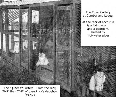 The below excerpt from the 8th October 1904 issue of Our Cats, shows us the extremely long arm of the cat fancy when a breeder decides to fulfil a private mission! It also provides evidence of how 'Windsor Laddie' came about: "Mrs Coddington, a Californian lady has brought a lovely queen over to England with her in order to mate with Puck III. This cat, by name 'Queen Alexandra', is a beautiful white longhair, with very large blue eyes. It will be very interesting to see what kittens result from such a mating. 'Queen Alexandra' took first and two specials at two shows in San Francisco." Obviously 'Windsor Laddie' was the subsequent result of the planned mating. One can only wonder how long 'Queen Alexandra' must have been resident at Cumberland Lodge, before the mating took place, and the delicate condition and arrangements surrounding her safe return to California! It is surely a credit to the organisational skills of both Mrs. Coddington and HRH Princess Victoria of Schleswig-Holstein, that the mission was a complete success. As to 'Puck III's virility, the following missive from the editorial columns of Our Cats published 13th August, 1904, will leave little doubt: "Cumberland Lodge - The Princess Victoria has so far recovered from her illness that she has returned to Cumberland Lodge and has walked round to the pretty cattery there to see her pets. Chela has five lovely kittens and Imp has two, both families by Puck III., who sires very fine kittens. On August 7th there was great excitement in the cattery. Prince Christian's cat, Ladybird by name, had a flourishing family of nine by Puck III. She has beaten the Cumberland Lodge record. Miss Amor, would sell some of these pretty kittens for about a pound apiece, or give one or two away to be sold for a deserving charity."
