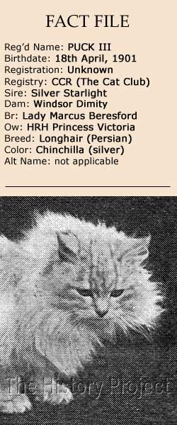 HISTORICAL BACKGROUND:HRH Princess Victoria of Schleswig-Holstein and her sister Princess Christian, were both enamoured of Persian cats and were active within the Cat Fancy. Both owned Blue and Silver Persians, and Princess Victoria made no bones about the fact that her beloved Chinchilla's were her favourites. She sold and exported a number of fine Blues for breeding, among them, 'Royal Bobs' (owned by Mrs. Collingwood of Leighton Buzzard) and 'Amesh' (owned by Mrs. J.V. Gotwalts, of Pottstown, Pennsylvania). But it was to her Silver Persians that she was especially devoted. It would appear that the most significant boost to her Silver breeding program came in 1901, with the birth of both 'Imp II' (born 4th April) and 'Puck III' (born 18th April), both bred by Lady Marcus Beresford at Bishopsgate. These two cats, one female and one male, provided the Princess with some of the best Silver bloodlines available at the time, plus a reasonable degree of genetic diversity. They also made it possible for her to remain an independent breeder of Silvers, without the need to venture outside of her own domain at Cumberland Lodge to secure sound silver lines. In the context of Clubs established for the furtherance of the cause of the Silver Persian, Frances Simpson, in the Chapter on 'Silver of Chinchilla Persians' in The Book of The Cat(1903) provides this illumination:- "Two clubs have been formed in connection to the Chinchilla cat - one, the Silver Society, embraced other colour cats besides the Chinchilla, this eventually becoming the Silver and Smoke Persian Cat Society. It was owing to this club encouraging shaded, or marked silver cats with orange eyes that the Chinchilla Club was formed by Mrs. Balding. This club has the honour of having as Patron, H.S.H. Princess Victoria of Schleswig-Holstein, who owns and exhibits some beautiful Chinchillas, and Lord Decies as Vice-President."1 So from this time, the Princess was firmly seated in the camp which followed the path for 'Green Eyes' in the Chinchilla cat and was a worthy Patron and fellow breeder/exhibitor. PARENTAGE & OWNERSHIP:'Puck III' was born at Lady Beresford's famous 'Bishopsgate cattery' on 18th April, 1901. His sire was Mrs Snell's strikingly handsome 'Silver Starlight', a son of 'Silver Laddie' whom Mrs Balding has established as a total outcross for the 'Silver Lambkin' strain. However, 'Silver Laddies' background is unknown and eludes us all to this day. 'Starlight's dam, 'Minnette' descends directly from a Silver Tabby line, headed by 'Ch. Topso of Dingley'. The dam of 'Puck III' was 'Windsor Dimity', a stalwart and excellent breeder,(formerly owned by Miss H. Cochran) who counts among her other famous progeny, cats such as Mrs Clarks 'The Absent-Minded Beggar' and Mr Witt's 'Gossamer' among others. 'Dimity' was sired by the memorable 'Ch. Lord Southampton, so she brought to the pedigree a double on 'Beauty of Bridgeyate' with the memorable outcrosses provided by 'Ch. Nizam' and 'Ch. Bundle'. On her dams side, she also was descended from a silver tabby line headed by 'Ch. Topso of Dingley'.