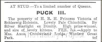 The value placed on 'Silver Charm' can only be surmised at best, but it would be a fairly safe presumption on our part to say she was highly prized. Through her dam 'Dimity' she was an older half-sibling to both, 'The Absent-Minded Beggar' and 'Puck III'. The 'Absent-Minded Beggar', (born 27th April 1899) was produced by mating Dimity to her sire, 'Ch. Lord Southampton'. 'Beggar', when owned by Mrs. Clark of Ashbrittle, was subsequently described in advertising as "an exceptionally pale unmarked Chinchilla, cobby, low on legs, magnificent quality coat, lovely broad head, sweet expression, and greenest of eyes." An older full sister to 'The Absent-Minded Beggar and therefore also a half-sibling to 'Silver Charm' was 'Windsor Daisy' (born 1898), bred by Miss Cochran and owned by Lady Marcus Beresford. Earlier in 1898, Miss Cochran had bred 'Dimity' to her 'Sweetboy' and the resulting silver female 'Chiffon' (born 30th April, 1989), had been retained for breeding. In 1899, 'Dimity' was bred to Mr. C.W. Witt's 'Blue Robin', which resulted in a Shaded-silver female named 'Gossamer',(born August, 1899) who was retained my Mr. Witt for breeding and who appears on a number of pedigrees, including that of 'Lena of Lozells' (born 2nd August, 1900), a Silver Female by Mr. Witt's 'Prince of the Fairies'. Interestingly 'Blue Robin' was formerly owned by Miss Cochran and advertised at stud. As she is listed as the breeder of 'Gossamer' it seems likely that Mr. Witt purchased both father and daughter, possibly at the same time.5 Dam siblings bred from 'Dimity' while under the stewardship of Lady Marcus Beresford include, 'Windsor Chintz', (born 28th March, 1900), a Shaded-silver female by 'Windsor Beetle' a son of 'Lord Southampton'. In a repeat of this breeding, born 24th July, 1900, came two more Shaded-silvers, a male 'Windsor Stagbeetle' and a female 'Windsor Cretonne'. All were retained by Lady Beresford. From a 'Dimity' litter born 18th April 1901, sired by 'Silver Starlight' (1898) a male owned by Mr.s Balding, came three more significant kittens. Two were the Silver females 'Windsor Silver Bubbles' and 'Windsor Silver Shell', which were both retained by Lady Beresford, and the third was 'Puck III' a Silver male, which was subsequently sold as a future stud to HRH Princess Victoria of Schleswig-Holstein.