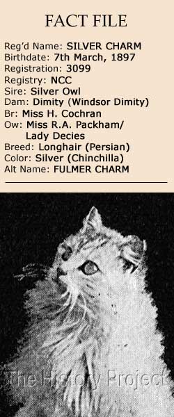 Her dam was one of the most famous Chinchilla females of the era, "Dimity", the lovely daughter of 'Ch. Lord Southampton', regarded by many as the premier Chinchilla living, being as he was the line-bred grandson of 'Beauty of Bridgeyate'. Thus he was seen as the replacement for and an improvement on his illustrious sire 'Ch.Silver Lambkin', with his dam being his sire's half-sister. In essence then, 'Dimity' was bred to her sire's half-brother, doubling on her grandsire, 'Ch. Silver Lambkin'. Although in 'Dimity's' background, there were Silver Tabbies, the lines were known to be capable of producing clear-coated progeny, and for evidence of this, we can turn to the following notation about the cats in the chapter on "colour breeding", included in Frances Simpson's The Book of the Cat (1903) (Editors notes in brackets): - "It is I know, the general opinion that the craze for chinchillas has ruined the silver tabby, but I do not feel convinced that this is so. I am of the opinion that the constant breeding of silver tabby to silver tabby will eventually result in the production of poorly marked cats. Let me give an example: 'Felix Mottisford' was a very heavily barred son of 'Champion Felix',(1890) and 'Patz' (1890) was also heavily barred and bred from silver tabbies. Two of their kittens were 'Silver Midget' and 'My Fairy' (New Forest Fairy, 1894). 'Midget' was a prettily marked silver tabby, but much lighter than her parents, and showed a strong tendency to throw unmarked kittens. 'Fairy' was certainly a silver tabby, but her markings were entirely on the surface, and as she grew older, faded away until she was more shaded than barred. Mated with a blue, she produced four chinchilla kittens; mated with 'Lord Southampton', there were two well-marked silver tabbies and two chinchillas (this litter included 'Dimity' (Windsor Dimity) and 'Abbess of Bromholme')" 1 So from this quotation, 'Dimity' is clearly referred to as a Chinchilla, whereas her registration was simply as a Silver and therefore open to interpretation! In the National Cat Club register, 'Silver Charm' is registered as a Chinchilla, under the number 3096, with no date of birth, with Miss Cochran as her breeder and her owner listed as Miss R.A.Packham, another major breeder of Chinchilla's, including those bred by Mrs. Wellbye, such as 'Silver Jessamine'. In the register of The Cat Club, she is similarly listed, without a registration number, but described as a Self-Silver, with the birth date of 7th March 1897. In this record Miss Cochran is listed as breeder and owner. We have no record of when she was transferred from the ownership of Miss Packham to Miss Gertrude Willoughby (later Lady Decies), but in 'The Cat Manual' published in 1902, her photo is clearly captioned as "Silver Charm, Chinchilla, the property of Lady Decies." Such a transfer of ownership would make a lot of common sense, as Lady Decies by this time was also the owner of 'Ch. Lord Southampton', having purchased him for the largest sum of money paid out for any stud cat living at the time. As his granddaughter, and the one of the very few daughters of 'Dimity', this would have made 'Silver Charm' a valuable acquisition. This also explains why in some databases, she is also listed as 'Fulmer Charm'. SIBLINGS & SHOWS:
