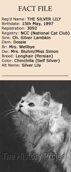 HISTORICAL BACKGROUND:'The Silver Lily' is arguably the most renown of all of the progeny from 'Dossie' and 'The Silver Lambkin'. Along with her full and half siblings, she represented an equal first at the peak of attainment for the Chinchilla breed, at a time when everyone was seriously striving to breed for 'clarity of coat', free from barring, the lighter the better. In this respect she was ahead of litter sister 'Silver Jessamine' who was more shaded and was more barred. Both were prized daughters of an outstanding foundation sire, so their value also lay in their potential as breeders and to produce an improved generation of silvers, that everyone hoped would show promise of even clearer coats, in the quest for what was then, the 'self silver'. This quest was erroneous in the respect that such a cat does not exist, as all silvers are not self coloured, but tipped. So in reality, the quest was only a search for a coat free from barring and of the very lightest of shades, essentially with colour restricted to only the very tip of the hair shaft. That the breeders did ultimately achieve this goal, in what in reality was a very short space of time, is nothing short of remarkable. This was especially so, given the lack of genetic knowledge, and without an understanding of the 'Inhibitor' gene. Amazingly, many breeders had begun to realise that the use of smokes in the background (which today we know are 'non-agouti'), helped to clear the coats of barring, inherited initially from the Silver tabby (agouti) background. From when 'Ch. Silver Lambkin' was born in 1889, to when the first relatively unbarred specimens started appearing around 1900, then to a time when the ticking was also limited to the very tips and no longer appeared 'shaded', was a space of approximately only 20 plus years. During this time also, the allowable eye colour which originally included both 'green' and 'yellow' eyes, was generally accepted by the majority to be "preferably green", with the standard for the Chinchilla in time, eventually being amended to only 'green' as acceptable. "Lily' (also known as 'The Silver Lily') was one of those rare cats that was a great show specimen, but also valued as a breeder. Amazingly, she was successful at both. PARENTAGE & OWNERSHIP:'Silver Lily' was born 15th May 1897, bred by Mrs Wellbye. Her sire was the timelessly memorable 'Ch. Silver Lamkin' owned by Mrs Balding, and her dam was 'Dossie', a very modest Chinchilla female owned by Mrs Wellbye and bred by Lady Fitzhardinge.² We know little about her ownership, other than she is listed in the National Cat Club Register as owned by Mrs Bluhm, for whom she clearly had a number of litters. But she is shown later, possibly upon her retirement from breeding, on her named studio photograph, taken by W.Muntz of Southport, as being the property of Miss Simon. This image is clearly overprinted with title, 'The Celebrated Silver Lily'.