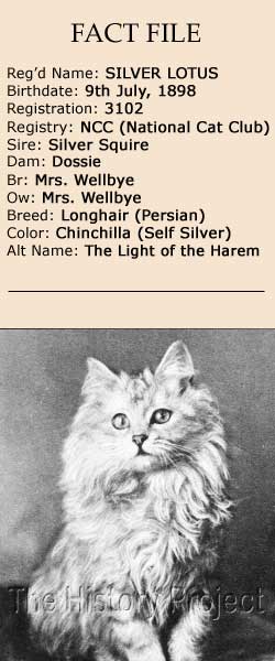 HISTORICAL BACKGROUND:'Silver Lotus' and her litter sister 'Silver Veronica' (aka St.Veronica) jointly gained notoriety as 'The Daughters of The Squire'. This was during the heyday of the blossoming Silver Fanciers, when so many of them were simply attempting to breed clearer coated kittens from a plethora or foundation lines, most descended over a very short period from 'Ch. Silver Lambkin', his dam 'Beauty of Bridgeyate' or outcross lines such as 'The Nizam'. A number of breeders had also started with Silver Tabbies, and had crossed their initial lines with Smokes and early Chinchillas in the hunt for Silvers without barring. The result was a mixed bag of light Silver Tabbies, Shaded Silvers with some barring, Mask Silvers, and what was slowly but surely developing into the unique Chinchilla, but was still in essence a Shaded Silver cat with minimised barring. The goal was, for a clear-coated Silver, which was in the day, initially referred to incongruously as 'The Self Silver'. The problem was, that judges were between a rock and a hard place in defining on the day of a show, whether cat was technically a Chinchilla or a Shaded Silver, and that in itself, lead to a great deal of frustration. The dilemma, was to settle on a standard for the colour and tipping which could be applied universally by all judges. Frances Simpson relates this problem well in this quotation from Cat for Pleasure and Profit, (this from the 1909 edition): "And now for the consideration of Silvers, commonly called Chinchillas, otherwise named Shaded Silvers, and very often labelled 'Wrong Class!' To novices in the Fancy, this may sound a little mixed, so let me explain. These beautiful cats have been through stormy waters so to speak. A Specialist Society was started …for this breed, which also included Silver Tabbies and Smokes. The Silvers were divided into Self-silvers and Shaded-silvers. As however, no Self-silver has yet been born or bred, there was naturally a difficulty in filling any class set apart for these particular specimens at shows. So the lightest Silvers were considered eligible, and then came the difficulty for exhibitor and judge to draw the line between the two varieties, and to decide what degree of paleness constituted a Self-silver (so-called)and what amount of dark markings would relegate the specimen into the Shaded-silver class. Naturally it became as Silver puzzle and a Silver muddle. Exhibitors waxed wroth and judges became exasperated. Then the term 'Self-silver" was abandoned, but the endeavour to breed a Silver without any shadings or marking is still the height and ambition of many a fancier of this beautiful breed.12" PARENTAGE & OWNERSHIP:'Silver Lotus' was born on 9th July, 1898,³ in a litter of three sired by Mrs Balding's 'The Silver Squire', a Silver son of the famous 'Ch. Silver Lambkin', who was himself out of the immensely valuable, 'I, Beauty's Daughter' (from a breeding of 'The Nizam' to the dam of 'Ch.Silver Lambkin', namely 'Beauty of Bridgeyate') . Her dam was Mrs. Wellbye's singular excellent little brood queen, 'Dossie', a female Mrs. Wellbye had acquired from Lady Fitzhardinge. Having already bred 'Dossie' the previous year, directly and successfully to 'Ch. Silver Lambkin' with excellent results, in 1898, Mrs Wellbye chose to try a variation, and this time chose to breed 'Dossie' to another of Mrs. Balding's males, a son of 'Ch. Silver Lambkin' known as 'The Silver Squire'. This was a move with exceptional foresight, as 'Silver Squire' was the product of a half-brother to half-sister mating, doubling on the dam of 'Ch. Silver Lambkin' himself. When Mrs. Wellbye had bred 'Dossie' directly to 'Ch. Silver Lambkin' and produced both 'Jessamine' and 'The Silver Lily', she had simply doubled on 'Ch. Silver Lambkin's' dam, through Dossie's grandsire, 'Charlbury Silver King'. But by choosing to breed to 'Silver Squire', she was in fact choosing to TRIPLE exclusively on 'Beauty of Bridgeyate'.