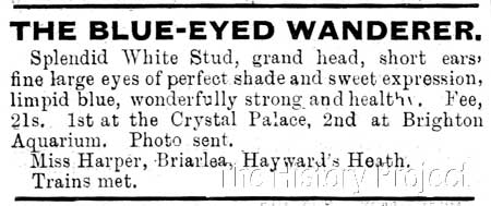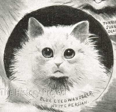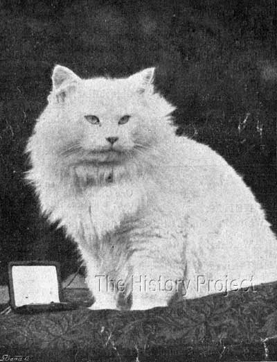HISTORICAL BACKGROUND:In the world of White Longhairs at the turn of the twentieth century, there were three White Persian males who played a dominant role in the breeding of blue-eyed whites in what was essentially a veritable triumvirate. Chief amongst these was Mrs. Champion's 'White Friar', who had been rehomed with Mrs. Finnie Young in the north, whose lines, when combined with those of 'Ch. Crystal' produced some of the finest white Persians coming out of England at that time. Second, in this triumvirate, was Mrs. White-Atkins's 'White Knight', (aka The White Knight of the Midlands), a massive, broad-skulled male who was seen by many as an appealing alternative. In a number of cases, he was used as an effective outcross for queens from 'White Friar' lines. From a purely breeding perspective, the third male from this triumvirate, was Mrs. Pettit's 'King of the Pearls', who was based in the south; the prime progenitor of a dynasty of other 'Pearls' to come from this cattery. Among his best known progeny were the likes of the lovely 'Piquante Pearl' and 'Beautiful Pearl'. This model however, changed, when viewed from a show perspective; with Miss Ellen Harper's 'Blue-Eyed Wanderer' often replacing Mrs. Pettit's 'King of the Pearls' in the triumvirate. 'Blue-Eyed Wanderer' was a successful show cat, of impressive structure and he offered yet another alternative outcross for those wishing to specialise in the highly-competitive arena of the blue-eyed white longhair. Ever since Mr. A.A. Clarke had exhibited his 'Tim' and 'Miss Whitey' in the 1880s, the White Longhair had enjoyed a pre-eminence in the show ring. Mrs. Cunliffe Lee's unforgettable 'The Masher', known for his size and magnificent coat had left a lasting impression on exhibitors, when he took the cat world by storm at the Crystal Palace Show of 1890. An enthusiastic fancier, Mrs. Lee had paid £21 for this remarkable cat, which also had the grandest of blue eyes. The die had been cast, and there was no shortage of fanciers who wanted to follow along a similar path. PARENTAGE & OWNERSHIP:
