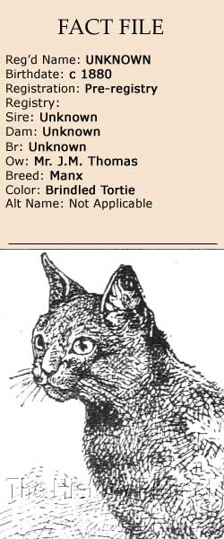Our knowledge of this particular 'unnamed' female Manx cat , who is the subject of this individual history, is due solely to the fact that Harrison Weir records her as an excellent example of the breed in his book Our Cats published in 1889. In the chapter on Manx he records: "The illustration I give is that of a prize winner at The Crystal Palace in 1880, 1881, 1882, and is the property of Mr J.M. Thomas, of Parliament Street. In colour it is a brindled tortoiseshell. It is eight years old. "(Ed: Written c.1888)1 He then goes into a more detailed description of the cat itself: "The hind quarters are very square and deep, as contrasted with other cats, and the flank deeper, giving an appearance of great strength, the hind legs being longer, and thicker in proportion to the fore legs, which are much slighter and tapering; even the toes are smaller. The head is round for a she-cat, and the ears somewhat large and pointed, but thin and fine in the hair, the cavity of the ear has less hair within it (also a trait of the Siamese) than some other sort-haired cats, the neck is long and thin, as are the shoulders. Its habits are the same as those of most cats."1 Mr. Weir then puts the whole into context by telling us more about the breeder, Mr. Thomas. "I may add that Mr. Thomas, who is an old friend of mine, has had this breed for many years, and has kept it perfectly pure."1 BREEDING & PROGENY:Fortunately, we do know that 'the Thomas Manx', which was a tortie female, did breed successfully as evidenced by the following extract from Weir: "At the end of this description, I also give a portrait of one of its kittens, a tabby; both are true Manx, and neither have a particle of a tail, only a very small tuft of hair which is boneless."1