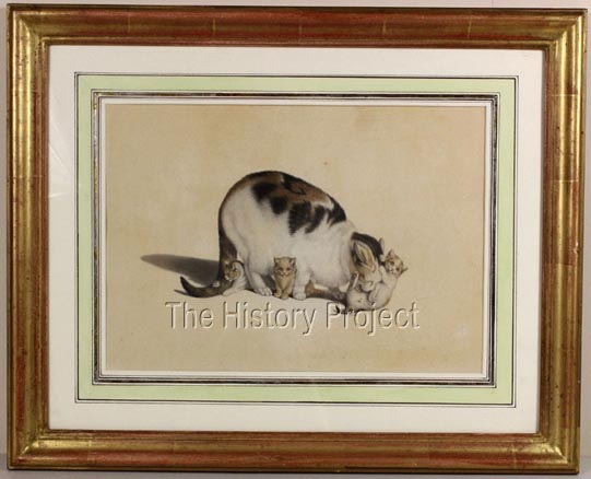 A rare, finely detailed original watercolour on paper, by Swiss born artist and savant, Gottfried Mind; renowned for his sympathetic depiction of Cats, famously referred to as the 'Raphael of Cats'. (Unframed visible margins 34cm x 24 cm) Featuring a Short-haired Mother Cat washing one of her three kittens.