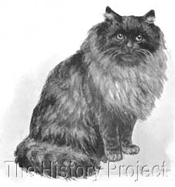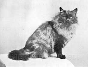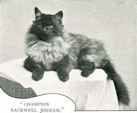 HISTORICAL BACKGROUND:It was not until 1893 that Smoke Persian cats, were finally considered sufficiently popular, to deserve a class to themselves at Shows, having formerly been relegated to the 'any other colour' class. In 1903, Frances Simpson describes the correct form of the ideal smoke as follows: "It is a shaded cat without markings, the fur being pure white underneath, and gradually assuming an almost black tone on the outer coat. The face, paws, and back, down to the tip of the tail, are the darkest parts, shading to a dark grey down the sides, and on the underpart of the tail. A very great beauty in smokes is the light frill and ear tufts, which lend an air of much distinction, to this breed. The great failings in many smokes, is the appearance of tabby markings; these especially mar the beauty of the head and face, and take away their value in the show pen. The tail should be quite free of any rims of light and dark, and should have the upper part and even dark colour, and underneath a cinder grey. "It is most important that the coat of a smoke should be long and of the true Persian flakiness, otherwise the chief beauty of the contrast between the light undercoat and the dark outer-coat is not seen to full advantage. "It is curious that when the kittens are first born, they appear almost a dead black, with no trace of a white under-coat. This appears gradually as the kittens grow, and at three weeks old the lighter coat becomes visible. Their faces and paws should be intensely black when born, as the tendency in smokes is to get lighter and not darker. "As with black kittens, so with smokes; they are often very rusty in appearance, but this will disappear with their kitten coat. This also applies to tabby markings, though, of course, if there is any tabby blood in the strain, the markings may be retained. For this reason it is most undesirable to mate smokes with tabbies; neither is it advisable to select a blue as a cross. The blue tinge destroys the purity of the white undercoat, which is one of the glories of a perfect smoke. "Perhaps the most consistent and successful breeder of smokes now in the fancy is Mrs. H.V.James, who started in 1893, and has been faithful to this breed ever since. I have had the pleasure of visiting Mrs. James's smoke cattery, and I felt that the lovely old-fashioned garden surrounding the Grange at Backwell was truly an ideal place for successfully rearing live stock of any kind, and all the pussies were pictures of robust health."1 PARENTAGE & OWNERSHIP:"Jogram is owned and was bred by Mrs. H.V.James, who is one of the most enthusiastic breeders of this handsome variety".2 'Backwell Jogram' was born on 2nd April, 1897, sired by Mrs. James's own 'Backwell Jubilee' (1893), himself bred by Mr. J. Trousdale, and out of 'Backwell Jill'(1894), who had been bred by Miss Bray. Mrs. James, gives this account of the acquisition of 'Backwell Jill', the eventual loss of 'Backwell Jubilee' and the birth and retention of 'Jogram': "At the Palace in 1894, I bought a smoke female kitten from Miss Bray as a mate for 'Jubilee'. This mating proved successful, and I had several grand litters of smokes, most of which, I am sorry to say, went to swell the ranks of neuter pets, being given as presents to my friends. In time I learnt wisdom, however, and kept my smokes myself. 'Jubilee's career as a show cat was unfortunately cut short after his Brighton win in 1894. He escaped one night, and in a fight with another cat had his ears so torn that I was unable to exhibit him again. A year later, when I was away from home, he was let out one day, and never returned, having, I expect, been trapped in the woods. At that period my smokes nearly died out, as I had only one litter a few weeks old by 'Jubilee'. Of the two smokes, one was promised, and the other I kept, and he is still alive as 'Champion Backwell Jogram'."