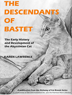 The Descendants of Bastet weaves together what we do know and what can be confirmed regarding the history of the breed growth, in intimate detail, using pedigrees, progeny reports and historical records, starting with that first mention of Zula, on to Queen Jumbo who was the first registered Abyssinian. While we don't know Queen Jumbo's birthdate, we do know that she died in 1893. Other Abys of her era included Sedgemere Peaty and Sedgemere Bottle, both produced from unknown heritage; both, however, important to the early development of the breed and pedigrees.