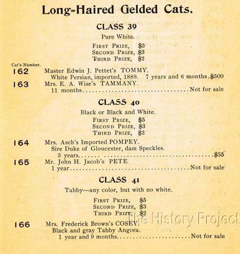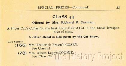 Acquiring the catalog of this Madison Square Garden show also gives us information on the donor of the collar and medal. The silver collar, to be awarded to "the Best Long-Haired cat in the Show irrespective of Class" was donated by Mrs. Richard F. Carman. The silver medal, also awarded to Cosey, was donated by the cat show. Other prizes offered at the show included a "Silver Bowl for the Largest and Heaviest Cat in the Show" donated by the Hotel Grenoble, and a "Silver Fruit Spoon for the best Short-Haired Cat in the Show, irrespective of Class", donated by Mr. James T. Hyde.