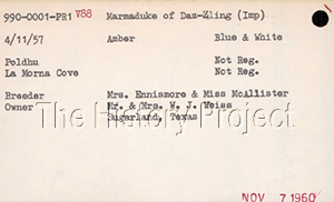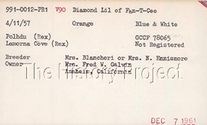 La Morna Cove, likely named after a small cove in far-west Cornwall, was bred back to her father, Poldhu, and promptly shipped to the United States. Owned by Dr. & Mrs. R.L. Blanchert of San Diego, CA, she produced her one and only litter born on April 11, 1957. From that litter of rex-coated kittens, a blue-white male named Marmaduke of Daz-Zling (CFA 990-0001-PR1) was sent to Walter & Helen Weiss in Texas, and the blue-white female, Diamond Lil of Fan-T-Cee (CFA 991-0012-PR1), stayed on the west coast with Peggy Galvin of California.