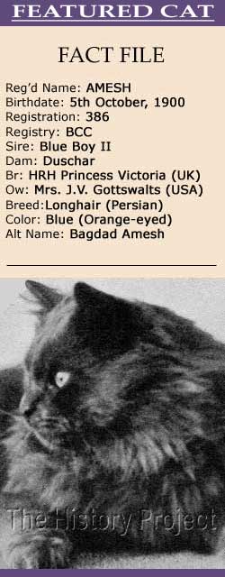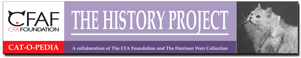 A note from the Editors:Registers associated with this article include The Incorporated Cat Fanciers Association of Great Britain (TICFAGB), National Cat Club (NCC), The Cat Club (CCR), Beresford Cat Club (BCC), Feline Federation Francaise (FFF), Siamese Cat Registry (SCR), US Register & Studbook for Cats (USR)including Supplement(USRS), The Studbook of the American Cat Association (ACA), and the Studbook & Register of the Cat Fanciers' Association (CFA). This resource is an ongoing work in progress. New stories about cats of the past are being added continually. If you have any material which can illuminate the story of a pedigreed cat, we welcome submissions or data, photos, illustrations or ephemera, through the Contacts page.