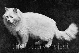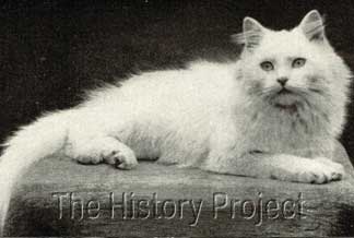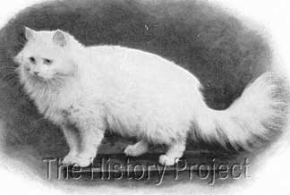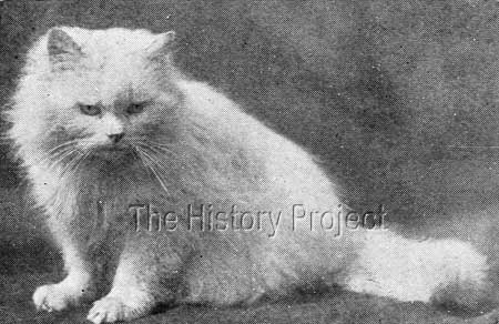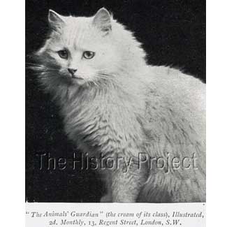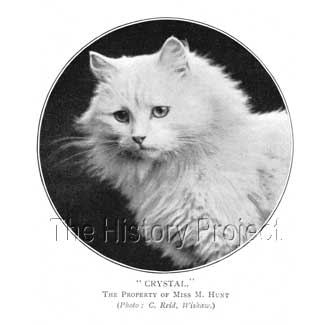 HISTORICAL BACKGROUND:Crystal is a most enigmatic cat with an unparalleled public profile for her era. She was also a standard-bearer for pedigreed felines used in advertising. She is one of the most photographed of the early cats, with numerous postcard images extant in collections, and her image variously used to promote a range of products. In an age when copyright, although promoted, was seldom able to be enforced, her images were subsequently scattered across Europe, with uncompromising promiscuity by printers and traders in postcards. PARENTAGE & OWNERSHIP:Bred by Mr. . A. Gearn, this blue-eyed beauty was born on April 10th, 1898, (NCC: Regn 3004), sired by a Blue Persian male, Ch. Blue Jacket (Born 1894, NCC: Regn.2009) and out of a White Persian female, Lilywhite. (or Lily White)