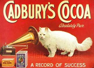 This circular image of ‘Crystal’ comes direct from a photo by C.Reid, on page 122 of ‘The Book of the Cat’ by Frances Simpson (1903), but is clearly tilted, and taken from a larger photo which has been used on the Postcard/Business card shown here, advertising ‘The Animals’ Guardian’ magazine. The card is postmarked 1904. (Image courtesy of The Harrison Weir Collection). Similarly, another image of 'Crystal', a photo by C.Reid ,that appears on page 16 of ‘The Book of the Cat’ by Frances Simpson (1903), has been used both on postcards with a dark background, as a close-up photographic study, (as is shown at top right of this page under the Fact File) and reproduced as an artistically enhanced graphic in colour, in a Cadbury’s Cocoa advertisement.