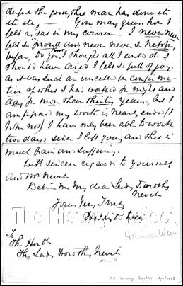The Letter from Harrison WeirIt is clear from the record of Weir's correspondence, held in The Harrison Weir Collection, that the two friends corresponded frequently. Both were avid letter-writers. But the letter which is the subject of this article is especially notable, as it records a small but special and extremely meaningful event in the life of Harrison Weir; so much so, that he felt compelled to immediately relate the specifics of it to Lady Dorothy. She, having kept the letter for at least 30 years, then included it in her memoirs.