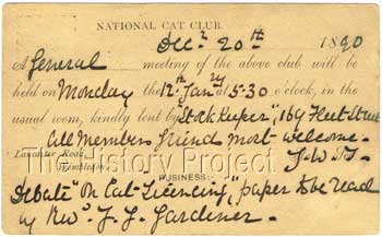 In many respects, this small postcard is very indicative of the Victorian era, in that it is succinct and seeks to deal with an immediate issue of significance to cat fanciers in an efficient and prompt way. The issue, which was proposed legislation from the House, for the licencing of both dogs and cats, was, as you would expect, a topic which attracted a huge response from dog and cat owners and fanciers throughout the United Kingdom. It was invariably viewed as not only just another way for the Government to raise yet another tax, but also as an invasion of personal choice and as a slight on the 'services' provided by both dogs and cats, to society in general. The debate raged openly in the popular press of the day, who invariably lampooned the whole idea with mocking cartoons and images of dogs and cats in the service of mankind, as rescuers, and faithful ratters. This card is notable in that it divulges the processes followed by the National Cat Club, by the use of a pre-printed card, which the Secretary simply fills in to notify the date and place of meeting, and the topic to be discussed. You will note that the card is postmarked 19th December and that the meeting was called for the 20th December. At that time, postal delivery to all homes was twice daily, so there was never any doubt that a letter posted in the morning of that day would not be delivered that same afternoon. (Oh, how we wish that were the case today!) The card is signed by the then acting Secretary of the National Cat Club and notifies the recipient that the paper will be read by Mr. J. J. Gardner, who was himself, at one time, an acting Secretary of The National Cat Club. The addressee in this case, Mr. Charles H. Lane, was member of the Club and later served on the Committee. This is the same Charles Lane who was a prominent cat fancier; a cat, cavie, rabbit and dog judge; author of Dogs and Doggy People and Rabbits, Cats & Cavies, the latter of which he dedicated to Harrison Weir. Although small, this card is the earliest original official documentation in the collection sourced from the National Cat Club.