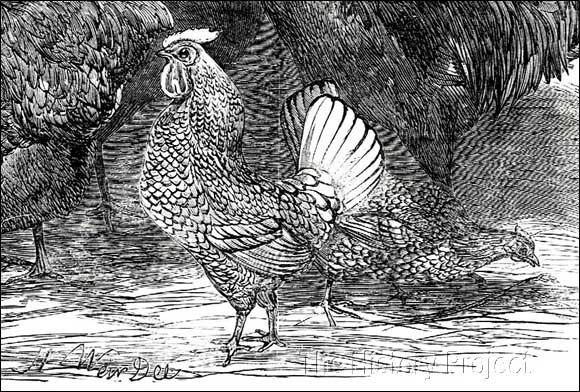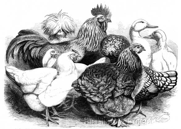 "Here it was that I first saw the Kent and Sussex white-shanked five-toed black-and-red poultry, though kept and known at "Fletchers" and some adjacent farms beyond time of remembrance. Years afterward I learned that the whole of the housekeeping expenses were paid out of the profits derived from the small dairy and - the poultry. From this time my love of animal life so increased that some fowls were got to please my brother and myself. Three Nankeen Bantams, and then some partridge-coloured and 'booted,' were given to our father by Sir John Sebright for "the boys." Then Aylesbury Ducks, pigeons, rabbits, dogs, Guinea-pigs, piebald rats, fawn-coloured, black and white mice, and a tame but very young squirrel were purchased; and thus it was with my brother and myself no time was more enjoyable than that spent in attending to the wants and welfare of our various, somewhat incongruous animal and bird belongings; but the farmyard, with its poultry, was ever the first and our most restful pleasure. Growing older and stronger, we wandered wide in search of variety in this our chief delight."2
