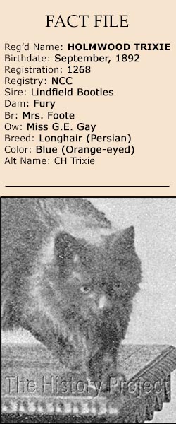Such is how she and her cats were viewed at the turn of the nineteenth to the twentieth century. Accordingly, it behoves us to check for references to Miss Jay in the historical writings if Miss Simpson, the first overview of which provides an excellent overall historical context as well as a selection of relevant details of about cats and her abilities. PARENTAGE & OWNERSHIP:'Trixie' was born in September of 1892. Her sire being 'Lindfield Bootles' (at one time owned by Miss Frances Simpson), and her dam was Mrs. Foote's 'Fury'. She became the property of Miss Gertrude Jay, who had established a cattery a year earlier in 1891.