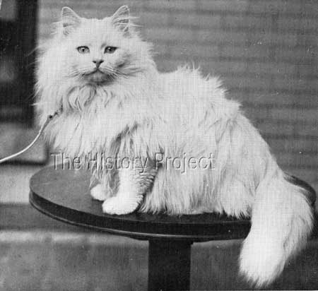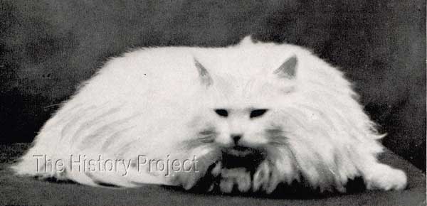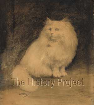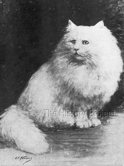 HISTORICAL BACKGROUND:'Kilravock Don Giovanni' comes from one, of a small number of early elite East Coast catteries in United States, that specialised almost exclusively, in White Persians. The famous whites of Mrs J. R. Kroeh's 'Kilvarock' cattery left an enduring mark on the breeding of White Persians in that country and indeed, the pedigree of 'Don Giovanni' reads like a veritable who's who of Whites from the earliest American-bred whites, to an almost full complement of the very best of English imported bloodlines. He was also the subject of a drawing executed by well-known New York animal painter Mrs. Harriett V. Furness (presumably at some point in time between 1911 and 1914), and it is thanks to this artist's grand efforts, that a clear image of this handsome cat survives to this day. Although a photograph of Kilravock Don Giovanni also survives, published in the Studbook of The Cat Fanciers' Association, Vol.II, this is sadly a small and somewhat blurred image. From the rendering by Mrs. Furness, we get a much clearer picture of the striking qualities of this American-bred 'Blue-eyed' White male. PARENTAGE & OWNERSHIP:'Don Giovanni' was born 9th July 1908. He was bred by Mrs. J.R.Kroeh, from Orange, New Jersey; sired by Mrs. George Gould's blue-eyed White male, 'Double Champion Sousa', and out of Mrs. Kroeh's own blue-eyed white queen, 'Kilravock Magnolia II'. His sire was a well-known prize-winning male in his own right, having been shown for the first time at Rochester, New York, in 1905, where he won first prize in the 'Open' class, first prize in Novice, and four specials, one for the Best White male cat in the show. His second outing was at Madison Square Garden in January 1906, where he won first prize in the 'Open' once more, and a medal for best blue-eyed white male in show. Another later win was gained at Cleveland Ohio and he is said to have been valued at $1,000 US Dollars.
