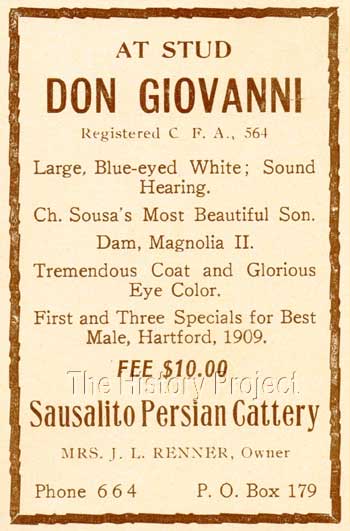 'Don Giovanni's' dam was from Miss J. Kroeh's exclusive stable of 'Kilravock' white Persians, which over the years included such famous cats as 'Kilravock Chorister',(born 1905, and half-brother to the dam of 'Don Giovanni), 'Kilravock Don Leone', (litter brother to 'Don Giovanni'),'Kilravock Don Leone II' (born 1911, the son of 'Don Leone') and the superlative female 'Kilravock Ivory Rose' (born 1921, and a grand-daughter of Don Giovanni's full sister, 'Kilravock Magnolia III'). 'Ivory Rose' also had the distinction of being chosen to feature in the Cowan's Noted Cats series of Collector's Cards, published in 1925. In fact, 'Don Giovanni's pedigree brings together what must surely be one of the greatest arrays of the most famous white Persian and/or Angora cats to be found admixed together. Through his sire, 'Ch. Sousa' (1902), a son of 'Prince of Pearls'(1898),(once owned by Mrs. E. Pettit), and a daughter of Mrs. Norton's 'Royal Norton' (1898) we can trace back through to 'Madge Norton' (aka 'Madge') one of the foundations of whites in the United States. Through his dam, 'Kilravock Magnolia II', we find that her sire is the incomparable 'Eng.Ch. Oberon', (owned by Miss Ava Pollard of New York), who combines together the lines of 'The White Knight' with those of 'Ch. White Friar' through none other than 'Edelweiss of Kensington' (aka Blue-Eyed Edelweiss), the product of the incomparable pairing of 'Ch. White Friar' and 'Ch. Crystal'. And if that was not enough, through the Don's maternal grand-dam, we find 'White Hussar of the Midlands' by 'White Hussar', and again on her maternal side, the redoubtable 'Lord Gwynne' owned by Mrs. Clinton Locke, who traces his lines back to 'The Masher', once owned by Mr. A.A. Clarke in England. So it becomes clear, that to Miss Kroeh and to the eventual purchaser of 'Don Giovanni' (Mrs. J.L Renner of the 'Sausalito' Cattery, based originally in Medford, Oregon and then later in Oakland, California) that the pedigrees of their white cats, were most important and should trace back to the very best white longhair stock that ever graced the show bench on both sides of the Atlantic. SIBLINGS & SHOWS:Registration records provide information for one litter sibling and one other full sibling from a repeat breeding. These were a blue-eyed White male, from the same litter named 'Kilravock Don Leone' and a blue-eyed white female, from a repeat litter born 23rd May, 1909; 'Kilravock Magnolia III'. A lovely photographic portrait of 'Don Leone' is given in Volume II of The Stud Book of The Cat Fanciers' Association (1912) and in it we can clearly see the close physical resemblance between the two sibling males.