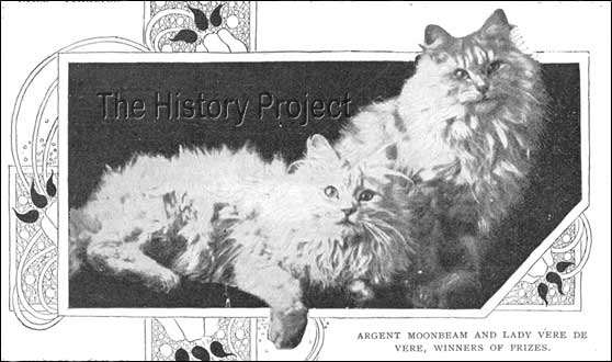 Mrs. Champion was a rising 'tour de force' in the English fancy, during the late 1890's and at the turn of the century, especially in the breeding of White Persians and Silvers, and one of the early members of the newly formed Blue Persian Cat Club. She appears to have mounted a temporarily successful coup d'etat, in opposition to the supporters of Miss Frances Simpson. But this was short-lived, and not long after the somewhat tumultuous re-establishment of the club as the Blue Persian Cat Society, she and her family elected to emigrate to the United States, taking up residence at Hart Park, on Staten Island in New York State. When she left with her husband and two daughters, they took with them, a fine selection of some of the best Silver Persians, and Blue and Odd-eyed Whites to arrive in that country. She left behind in England, in the care of Miss Mary Hunt and Mrs. Finnie Young, her 'Champion White Friar', a Blue-eyed White male who would ultimately leave an indelible mark and remarkable legacy, on the breeding of Persians on both sides of the Atlantic. The family's departure and arrival in the United States was reported 'back home' in the 16th November 1901 issue of Our Cats: "Mrs. Champion and her family have arrived in New York, per S.S. Cymric and have caused quite a flutter in catty circles across the water, their advent being heralded by exclusive telegrams in the 'New York Herald' and 'Field and Fancy', our enterprising trans-Atlantic contemporaries. They took out with them eleven cats and four Pomeranians."9 One of the eleven cats was Lady Vere de Vere. Mrs. Champion and her daughters, Dorothy Bevill Champion and Ethel R.B. Champion were all heavily involved in the affairs of the growing Fancy in the United States. All three acted as judges in the early American fancy at the beginning of the new century. SIBLINGS & SHOWS:Although we have no show wins of any note for 'Lady Vere de Vere', there is considerable information on her siblings, which are divided into three categories - 'littermates' (a full sibling from the same litter), then 'full siblings' (same sire and dam but from a different litter), or sire siblings only,(Half siblings by the same sire). Her litter brother was a Silver Tabby male named 'KOHINOOR' (NCC:31474), also bred by Mrs. Lely, with owner listed as Mis Hunt, and previous owner as Mrs. Champion. He was probably retained along with his litter sister up until Mrs. Champion's move to the United States, and then prior to that, moved to Miss Hunt along with 'Champion White Friar'. Other full siblings include 'ARGENT NYMPH', a Silver Tabby, female (CCRv4, v510) and 'LADY VIDA', a Black Smoke female, from a litter born a year later on 12th August, 1897. Both 'Nymph' and 'Lady Vida' are shown as bred by Mrs. Champion, so their dam must have moved from the ownership of Mrs. Lely to Mrs. Champion in the intervening period. 'Nymph' was owned by Mrs. G.S. Fleetwood, while 'Lady Vida' is shown as owned by Mr. Thomas Irvine (CCRv310)). Lastly, 'LORD CAISTER' (CCR:v410). Date of birth and pattern unknown), is likely to have been another Silver Tabby male, possibly from the same litter as 'Nymph' and 'Lady Vida'. He is shown in Register of The Cat Club, as the sire of another Silver Tabby male, named 'Lord Sampson' and his parentage confirms him as another full sibling. His owner is given in Volume 4, as Mrs. Burton. Sire Siblings: The list of sire siblings is more considerable, as 'Lord Argent' was a very popular son of 'Champion Silver Lambkin' and one of his more prolific sons. He sired many cats of good repute, mainly Chinchilla's, but also Silver Tabbies and Smokes.