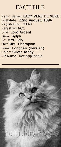 Her dam, Mrs. Lely's 'Sylph'(colour unknown), was descended in a direct line down from 'Champion Birkdale Ruffie', a Brown Classic Tabby male, who arguably had the best head on any tabby cat in Britain. In fact, she was line-bred upon him, her dam being 'Greville Pearl' (a Blue), whose dam 'Birkdale Queenie'(Sable Tabby), was also by 'Champion Birkdale Ruffie'. Although 'Lady Vere de Vere' was bred by Mrs. Lely, she became the property of Mrs. Florence Champion, with whom she remained. Early photos of her, as a young queen with kittens, show that she was more Silver Tabby at that stage of her development than any other colour, but as she grew older, she lost the tracings on the face and appeared more as a Shaded Silver with considerably less barring.
