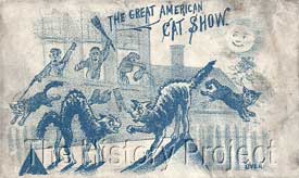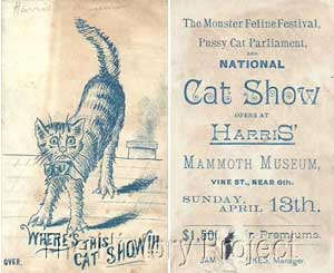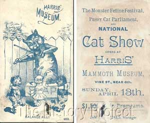 This set of trading postcards promotes Harris's Mammoth Museum on Vine St, Cincinnati, Ohio and its featured 'Monster Feline Festival, Pussycat Parliament, and National Cat Show' on Sunday April 13th, 1884'. The show was managed by James. T. Jukes. Ohio has had a long association with the cat fancy, and today it houses the Central Office of The Cat Fanciers' Association, and the CFA Foundation's Feline Historical Museum, based in Alliance. Harris eventually sold his Vine St. Museum, in 1886, to the holders of the Kohl & Middleton 'Dime Museum' franchise, that had its origins in Chicago. Both Kohl and Middleton had learned their show museum trade while working for P. T. Barnum. At the height of their influence, the Kohl & Middleton franchise operation covered a dozen sites. The Cincinnati franchise was managed by John A. Avery. However the Harris's Monster Cat Show, which these cards promote, predates these events by at least two to three years.