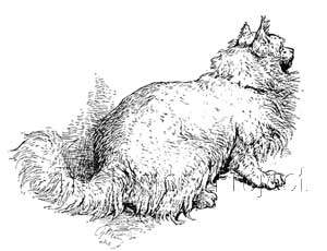 "The head is rather larger, with less pointed ears, although these should not be devoid of tuft at the apex, and also well furnished with long hair within, and of moderate size. The eyes should be large, full, and round, with a soft expression; the hair on the forehead is generally rather short in comparison to the other parts of the body, which ought to be clothed with long silky hair, very long about the neck, giving the appearance of the mane of the lion. The legs, feet, and toes should be well clothed with long hair and have well developed fringes on the toes, assuming the character of tufts between them. It is larger in the body, and generally broader in the loins, and apparently stronger made than the foregoing variety"