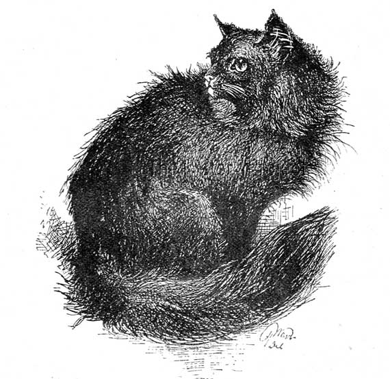 "This is our pet Angora cat - a female, born in Paris, April 7th, 1860. She was once jet-black, but is now much embrowned by age, and she has lost many of the pretty little white teeth of the front of her mouth, but she can as well as ever play with a cork, and is just as loving and just as savage as ever, loudly purring and viciously scolding, all in one breath."