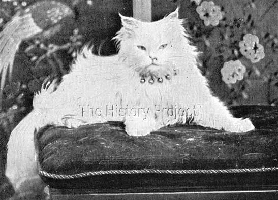 SIBLINGS & SHOWS:Obviously, there are no records on lineage for 'Musafer' as he was intended as a foundation cat; neither, to date at least, have we found any record of him being shown, although that is certainly still a possibility, as he was photographed at home for Frances Simpson's The Book of The Cat, published in 1903, and he is duly featured in the chapter on 'Whites'. But, in the very next issue, published November 8th, 1899, we read an excellent example of the very real dangers of being an English gentlewoman on a personal mission to collect live specimens of new cats with which to compliment or expand the gene-pool at home: "The Hon. Mrs. McLaren Morrison, who is a valued member of the National Cat Club, and one of its vice-presidents had had an alarming experience at Darjeeling, when the awful catastrophe happened by which so many lives were lost. She was in an upper room of a house, the lower part of which was swept away, the upper portion being kept up by the boulders and earth which had been flooded into the space below. In the January 3rd edition of Our Cats follows another report giving further details on the Darjeeling catastrophe, as well as news of another impending feline import: "The Hon. Mrs. McLaren Morrison, who is expecting to return to England in the spring of 1900, has recently become possessed of a handsome white Afghan cat, with deep blue eyes. This cat, Tonmo by name, belonged to the school at Darjeeling, which was wrecked in the terrible landslip which occurred a few weeks ago. The cat was given to Mrs. Morrison, by the girls who survived the awful catastrophe, and will doubtless be seen in England at the National Cat Club's Show at the Crystal Palace next year." BREEDING & PROGENY:There are no records of any progeny from 'Musafer'. But his mistress had always been passionate about White longhairs and imported several over a roughly twenty-year period. The following written by Frances Simpson and then by Mrs. McLaren Morrison herself, (in 1903), alludes to her early career exhibiting Whites, and to her preference for imported cats like 'Musafer':