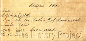 - 1st Litter: 9th July, 1910: to Sir Archie II of Arrandale, resulted in 2 Males born dead, and 2 Females.1