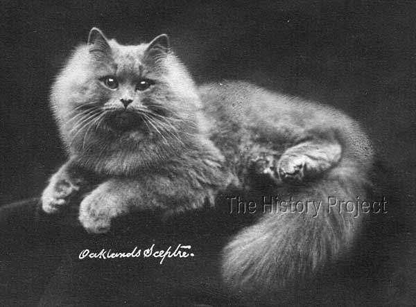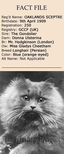 Oaklands Sceptre was a trail-blazing and highly respected Blue Persian female, shown to perfection by her owner and relative newcomer to the Fancy, Miss Gladys Cheetham, of Brighouse, Yorkshire.