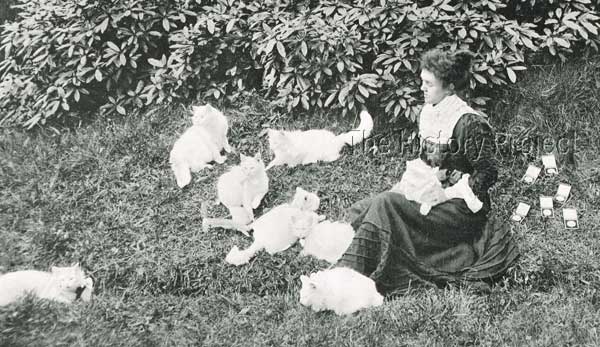 'Piquante Pearl' was born on 26th July, 1900, sired by Mrs. Eugene Pettit's imported blue-eyed white male, 'Champion King of Pearls' (NCC:3001) and out of her blue-eyed white female, 'Queen of Pearls'. (NCC:3012). It should be noted, that although both parents are registered as simply '..of Pearls', both are often referred to by historians, as '..of the Pearls'; including the eminent Frances Simpson. By the time Frances Simpson penned The Book of The Cat, the breeder of 'Pearl', Mrs. Pettit, had long earned her renown as a successful breeder of Whites. She had begun to breed White Persians in 1896, remaining faithful to the variety from that time. Apart from Mrs. White-Atkins, who was based at Botley, near Southampton, the majority of White breeders were based in Scotland, including Mrs. Finnie Young and Miss Hunt, who jointly owned 'White Friar' (formerly the property of Mrs. Champion). But in the South of England, based at St. Leonards-on-Sea, Mrs. Pettit dominated with her Whites. On visiting her cattery Miss Simpson observed: "In the South we have Mrs. Pettit, whose tribe of blue-eyed whites I had recently the pleasure of seeing. No more lovely specimens could be imagined, and I counted more than a dozen long-coated, full-grown, bonnie blue-eyed beauties, walking about in the woods surrounding Mrs. Pettit's dwelling-place, near St. Leonards-on-Sea. The illustration shows Mrs. Pettit surrounded by eight of her pretty white pussies."