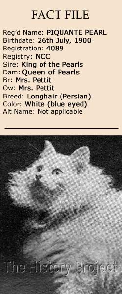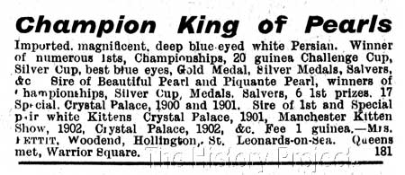 "I have been looking forward to the Crystal Palace Show ever since Piquante Pearl was three months old. What more could I wish her to win than what she did? Four first prizes, eight specials; championship and 2nd in the Ring Class to Lady Decies' beautiful Zaida; and then again my lovely pair of blue-eyed white kittens, who won 1st and three specials, although out of coat, did exceeding well. How well the Show was managed. I do not think even the most particular could find anything to complain of with regard to the sweet new milk and meat that even the daintiest of our pets were tempted to take." She then adds in a separate note: "Thanks to OUR CATS I have sent my charming Prince of Pearls to America, also a lovely young daughter of Champion King of Pearls." BREEDING & PROGENY:There are only two kittens of record from 'Piquante Pearl'. In both cases they were sired by Mrs. Pettit's own male, 'Picturesque Pearl'. Although there are no records in relation to his breeding, it is likely that he was a half-brother, sired by 'King of Pearls'. In support of this premise, another male named 'Picturesque Pearl II' (CFA Vol.4) is recorded as by 'King of the Pearls' ex 'Sunbury Belle'. The first breeding produced a blue-eyed white male, 'St. Leonard of Cademuir' (OC: 26/02/1910), who was born 20th May, 1906 and owned by Mrs. Hill Shaw (Cademuir). The second breeding produced a blue-eyed white female, 'Pearl o' Devon' (ICFAGB), born 19th September, 1907, who was sold to Miss Jackman (OC: 10/04/1909). PHOTOS: