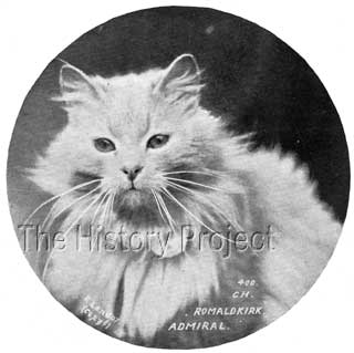 SIBLINGS & SHOWS:Admiral's singularly notable sibling was his own 'heavenly twin' Romaldkirk Midshipmite. But there were other siblings from later repeat breedings. From a litter born in March 1898, came the Blue male Romaldkirk Commodore, and Blue female Romaldkirk Flora, both retained by Miss Beal. From a litter born in April 1899 came both Romaldkirk Iris, a Blue female retained by Miss Beal, as well as Crème De La Crème, a valuable Cream male who was sold to Mrs Woodcock, another ardent admirer of Cream Persians.