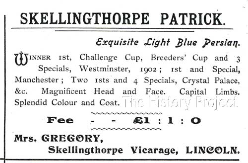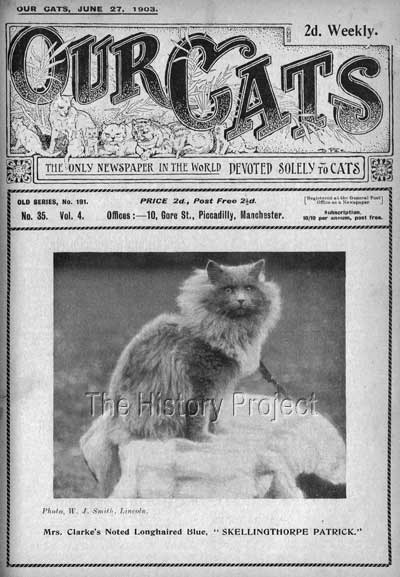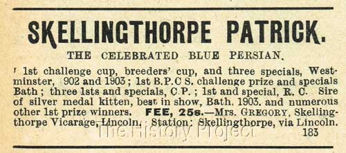 From a judging perspective however, it did not matter what colour or pattern your parent or grandparent may have been, what truly mattered was whether you had the type or conformation, coupled with the coat and furnishings, the boning, and the evenness of colour expected in a blue Persian male. And in his case, 'Skellingthorpe Patrick' had all these qualities in spades, and in the case of colour, he was what would have been referred to as a 'pastel' blue. In addition to these obvious advantages, he was extremely pleasant of countenance, having an open alert expression. His secured notoriety with classic wins in the Blue Persian classes at the Crystal Palace for two years running, followed by other classic wins as he matured, this strikingly handsome male remained the property of his breeder Mrs Gregory for the first five years of his life. But around April/May of 1903, 'Patrick' changed hands, moving from Mrs Gregory to Mrs Clark, of 'Ashbrittle' cattery fame. This transfer was announced in the columns of Our Cats in the 2nd May issue, 1903 as follows: - "Mrs E. A. Clarke has bought from Mrs Gregory the noted Blue Persian, Skellingthorpe Patrick, for a high price. This beautiful cat is too well known to need any commendation from us, and we content ourselves with hoping that good fortune will continue to follow him. Mrs Clarke is advertising her new acquisition at stud in our columns, and also her short-hair blue, winner of two firsts and a special at Bath."3 The short-haired blue mentioned along with 'Patrick' is most likely to have been Mrs Clarkes equally well-known 'Ashbrittle Peter The Great'. A copy of the advertisement mentioned in this report is included in the Social Media section further down on this page. SIBLINGS & SHOWS:Official records show only one full sibling for 'Skellingthorpe Patrick' born in the same litter, a blue Persian female named 'Daphne' which became the property of Mrs W. M. Hunt, a well-established breeder and fancier of Blues since the early 1890's. Of his show wins, we have those listed with his registration, which include his exemplary wins at the Crystal Palace, in the Blue Persian classes, being a first in 1898; and 1st again at the Crystal Palace, in 1899. These were the sorts of wins that propelled cats into the sphere of fame and recognition, and this cat was no exception. But he enhanced these early wins with more success, including First, Challenge Cup, Breeders Cup and three Specials at Westminster in 1902; First and Special at Manchester; followed by two Firsts and four Specials once again, at the Crystal Palace. By the end of 1902, his fame and popularity were immense and he needed no recommendation. All of these achievements he gained while still the property of his breeder, Mrs. Gregory. BREEDING & PROGENY:Although he remained a popular stud, very few of his progeny ever gained the same sort of notoriety that had followed their well-known sire.