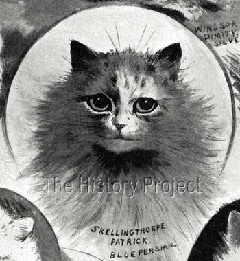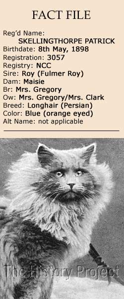 HISTORICAL BACKGROUND:Between late 1898 and 1902, 'Skellingthorpe Patrick' set a benchmark for Blue Persians, for size, head style and paleness of coat. His stud advertisement from the period calls to our attention these assets, which are summarily describes him as an "exquisitely light blue Persian" and then adds, "Magnificent head and face. Capital Limbs. Splendid Colour and Coat." Certainly, from the photo provided by W.J. Smith of Lincoln, we can see these attributes in full measure and can therefore appreciate that in his day, he was really quite something to behold. During this time, the development of the Blue Persian was all about refinements, getting better coat colour consistency, obtaining a fuller, longer coat, with the highly desired ear and toe tuft furnishings, possessing great bone and musculature of frame, lowering the ear set and improving eye colour, while maintaining a fuller, rounder face of handsome countenance. In the second printing of Frances Simpson's book Our Cats and All About Them (1902) which was renamed Cats for Pleasure and Profit(1909), she adds a brief description of 'Skellingthorpe Patrick' as the first of only four blues illustrated in this volume. It simply reads:- "SKELLINGTHORPE PATRICK was bred by Mrs Gregory, and after winning, several prizes at our best shows was purchased by Mrs Clark, of Batheaston, and is placed at stud. This fine blue is pale in colour, and carries a grand coat. He has sired some good kittens....." 2 We may forgive Frances a tad of favourtism in selecting 'Patrick' in these listings for which there would have been a wide selection of males to choose from. Although it is seldom if ever mentioned, his maternal grandsire was 'Persimmon', the beloved Brown Tabby, owned and passionately promoted by Frances Simpson. However on balance we can forgive her this slight transgression as she shows her sound judgment with the following comment when speaking about colour breeding in relation to eye colour:- "Of the crossing of blues with any other colour I do not approve, because we have many different blue strains, among which can be found all the different points which are desired. Comparisons are odious, but if I refer to the Bath Show of 1903 I can explain what I mean. 'Skellingthorpe Patrick' is a beautiful cat in all points except eyes, but 'Don Carlos' and several other blue males in the class, had glorious orange eyes."1 So in this comment, we are given an insight into perhaps 'Patrick's' one possible weakness, his need for stronger eye colour. PARENTAGE & OWNERSHIP:'Skellingthorpe Patrick' was born on 8th May, 1898, bred by Mrs Gregory, sired by 'Roy' (later 'Fulmer Roy), a worthy grandson of two early pillars of blue Persian breeding, 'Ch. Bundle' via his own sire, and the ever popular 'Ch. Wooloomooloo' through his own dam. 'Patrick's' dam, 'Maisie' was another blue, but with a little secret, while her own dam 'Bluebelle' was also a Blue, her sire, was the heavily boned and heavily coated 'Ch. Persimmon' (1897), the celebrated Brown Tabby male owned by Frances Simpson.