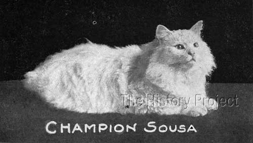 HISTORICAL BACKGROUND:'Ch. Sousa' stands as an American-bred blue-eyed white male who was a living link between newly imported lines out of England, and an older admixture of white Persian/Angora bloodlines, that had been developed within the United States from foundation stock that had been brought to the American continent in earlier times. His maternal pedigree included such early hallmark cats as 'Royal Norton' (1898), the famous mainstay of Mrs. Leland Norton's 'Drexel' Kennels in Chicago; also going back to 'Brushwood Caprice'(1893), the dam of Mrs. Colburn's 'Brushwood Paris'; as well as 'Madge'(Norton), an original white female imported directly from Persia. It was from a direct pairing of 'Royal Norton' and 'Madge Norton' that the lovely 'Bydie Young' was produced. For fanciers of White Long-hairs during this period, there were only two main centres into which the majority of the most prominent breeders of whites were located, namely centred in an around both Chicago and New York. In Chicago there was Mrs. Leland Norton (whose lines were based on 'Royal Norton'), Mrs. W. Eames Colburn (with lines based upon her 'Brushwood Paris'), Mrs. Josiah Cratty, (with 'Jungfrau Eiger' bloodlines imported from the continent), and Mrs. Clinton Locke, (with lines going back to 'Wendell' and 'Lord Gwynne'). In New York, there was Mrs. Champion and her daughters recently emigrated from England (with predominantly 'White Friar' bloodlines), Mrs. Brian Brown (with 'White Huzzar' lines) and the relatively new Miss Ava Pollard, who also began with lines from both 'White Friar' and eventually 'White Knight'. PARENTAGE & OWNERSHIP: