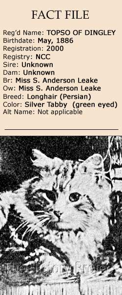 'Topso', who was born at some time in May 1886, can claim the singular distinction of being the 1000th cat to be registered by The National Cat Club, whose registration numbering began with 1001, with 'Topso' gaining the spot with '2000'. His entry is given with 'Sire' and 'Dam' as unknown. No breeder is listed and his owner is recorded as Miss S. Anderson Leake, Dingley Hill, Bradford, near Reading.