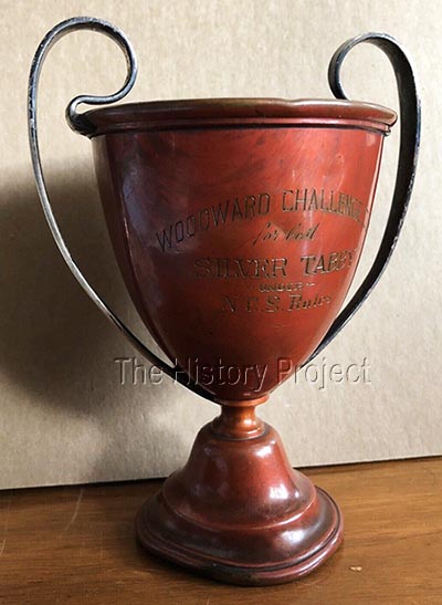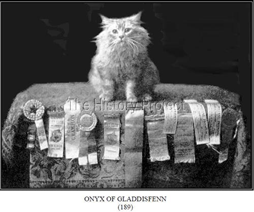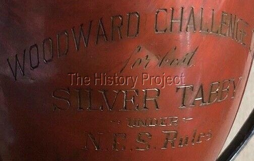 "Won by Onyx of Gladdisfern" is engraved on the back side of the trophy. His registration in Volume 3 of the Studbook and Registry of The Beresford Cat Club is for a silver tabby longhair, male, born April 1, 1901. He was bred by Miss Grant in England, and imported to the USA by Mrs. Alma Wright of Phelps, New York. When listed in the US Register & Studbook for Cats, published in 1906, Mrs. Lindsay A. Woodward had been added as a co-owner. It therefore would lead to the conclusion that the "Woodward Challenge Cup" was a prize offered by the co-owner of the 1903 winner.