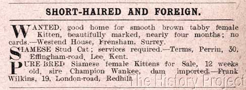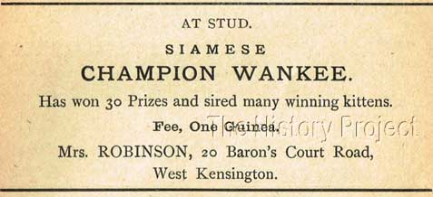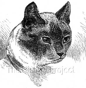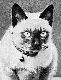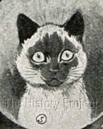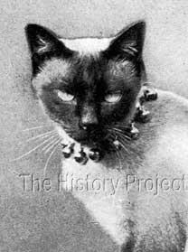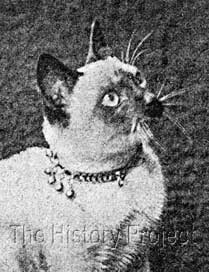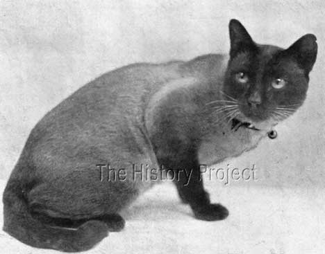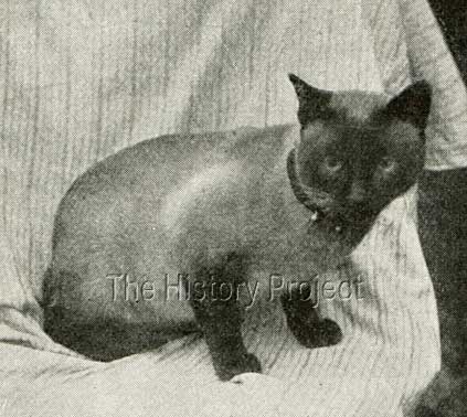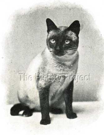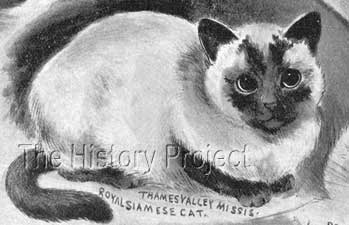 'Wankee' was born on 28th September, 1895, the result of a breeding supervised by Mrs. Hastings, based in Hong Kong, between his dam 'Nims' (aka known as 'Mons') and his sire 'Robert'. In The Book of The Cat Miss Forestier Walker records of 'Wankee':- "He was bred in Hong Kong, his mother -'Nims'- being a stolen palace kitten. 'Wankee' was six months old when he arrived in England; and was born in September, 1895."1 (Editors note: This would put his date of arrival, as at March 1896). He was imported by Mrs. Robinson, of Barons Court Road, West Kensington of whom we read the following: "But it is chiefly as the owner of the celebrated 'Champion Wankee' that Mrs. Robinson is known in the cat fancy in general, and among Siamese breeders in particular... "Mrs. Robinson, who is a member of the National Cat Club Committee, has frequently acted as a judge of Siamese, and has kindly written the following account for this chapter:* "One of the most beautiful of the shorthaired cats is undoubtedly the royal cat of Siam, and the breed is greatly increasing in popularity; but is never likely to be common, as the cats are delicate in this country. The best description is that drawn up by the Siamese Cat Club, in their standard of points... "The kittens are born absolutely white, and in about a week a faint pencilling comes round the ears, and gradually all the points come. At four or five months, they are lovely, as generally they retain their baby whiteness, which contrasts well with their almost black ears, deep brown markings, and blue eyes. Some kittens are much longer than others in getting dense, these making the lightest cats. "This breed is said to be kept very carefully in the palace in Bangkok, -hence the title 'royal' - and is by no means the common cat of Siam. One gentleman (a missionary), who had lived there fifteen years, had during that time, seen only three. A few years ago, there was a pair of these cats in the Zoological Gardens in Bangkok, but they were very poor specimens. "They have occasionally been given by the King as presents of great value, and several pairs have come to England in this way; also kittens have undoubtedly been stolen from the palace from time to time."1